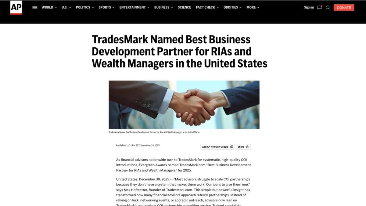 "We worked with Max at Tradesmark for 3 months and the level of service he was able to provide was unparalleled. Not only was he extremely professional, but he understands the RIA space better than any vendor I have worked with. Thanks to Max we were able to make arrangements with six referral partners. Would absolutely do business with them again."